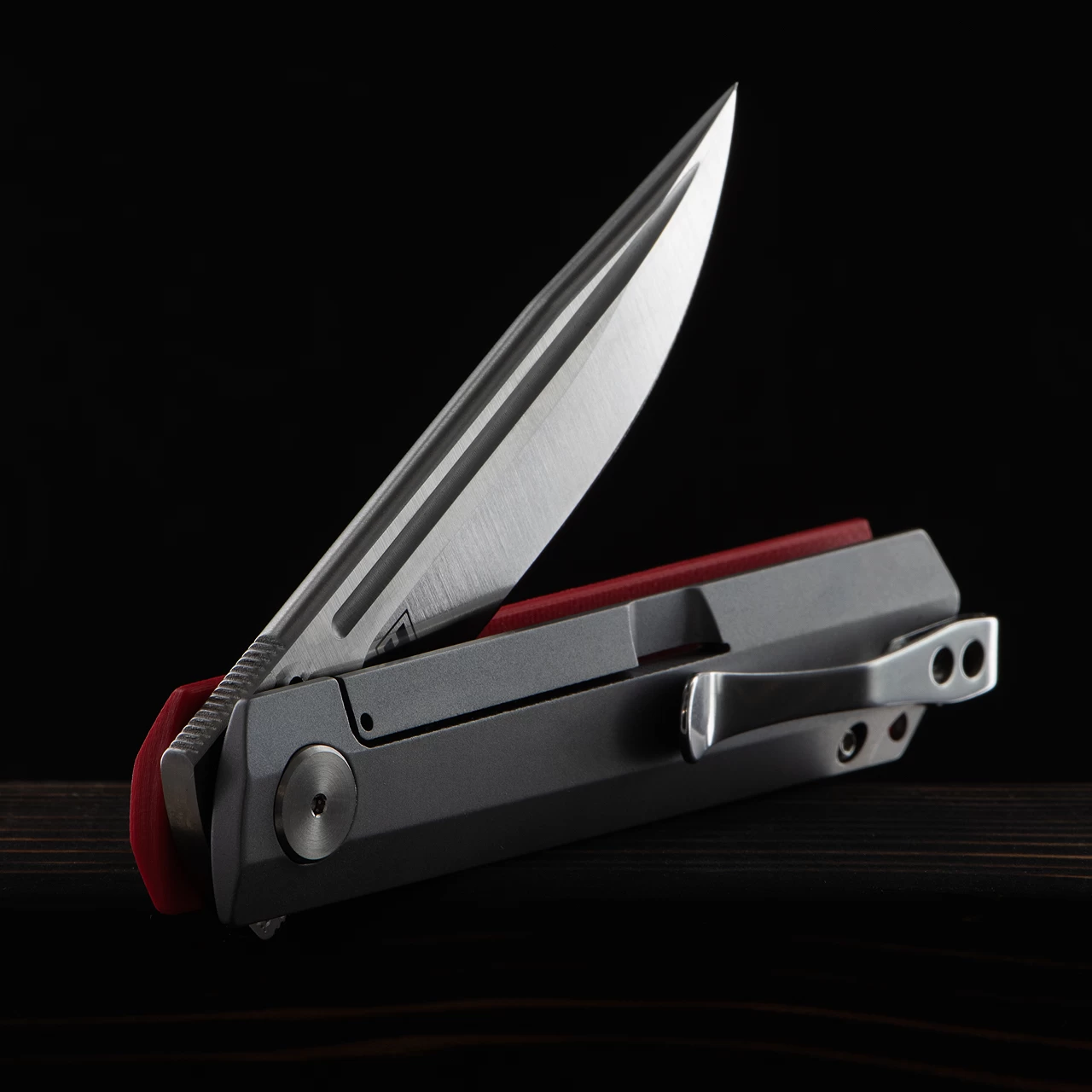 The sturdy blade of satin-finished 440C has a flat grind and a groove on both sides. The straight-lined design is supplied with a textured handle scale made of Heinnie® red G10, which is milled three-dimensionally and has a weight-reducing recess on the inside.