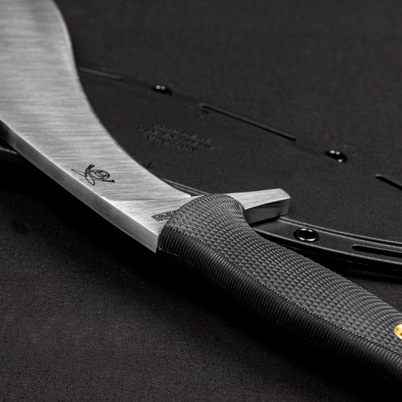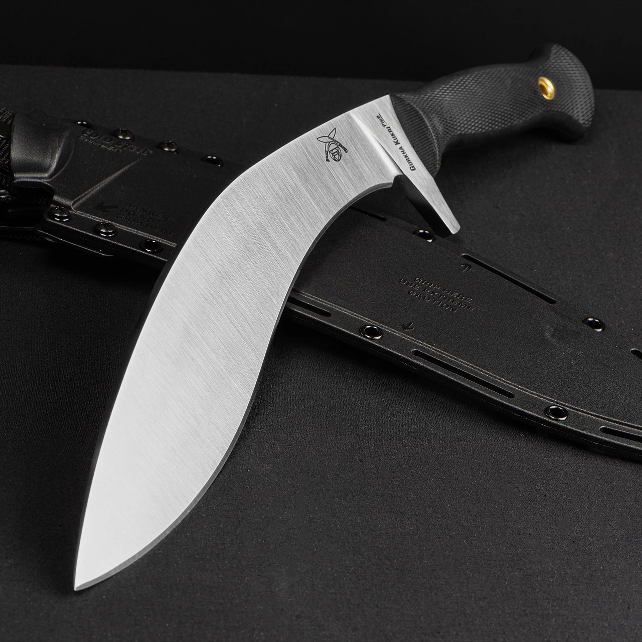 The Cold Steel Gurkha Kukri was inspired by Cold Steel President, Lynn C. Thompson’s close association with Dr. Maung Gyi, chief instructor of the American Bando Association. Under Dr. Gyi’s tutelage, Lynn gained insight into the full potential of the Kukri. With Dr. Gyi’s input, Thompson designed a longer, narrower point for the Gurkha Kukri with more distal tapering to the spine. This resulted in a thinner, sharper point. Finally, a masterfully designed Kray-Ex handle was added to maximize the blade’s potential. Perfectly contoured and deeply checquered, it offers a superb non-slip grip and cushions the hand.