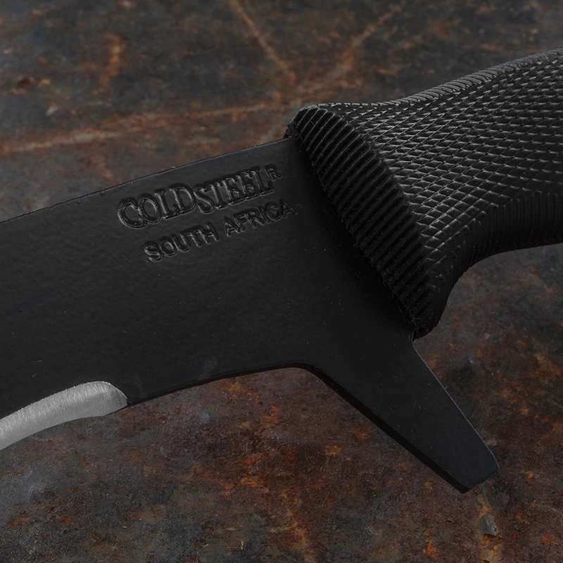 Featuring a rust resistant baked on matte black coating, the fully sharpened and expertly tempered 1055 Carbon Steel blade is safely and securely carried in a sturdy Cor-Ex sheath.