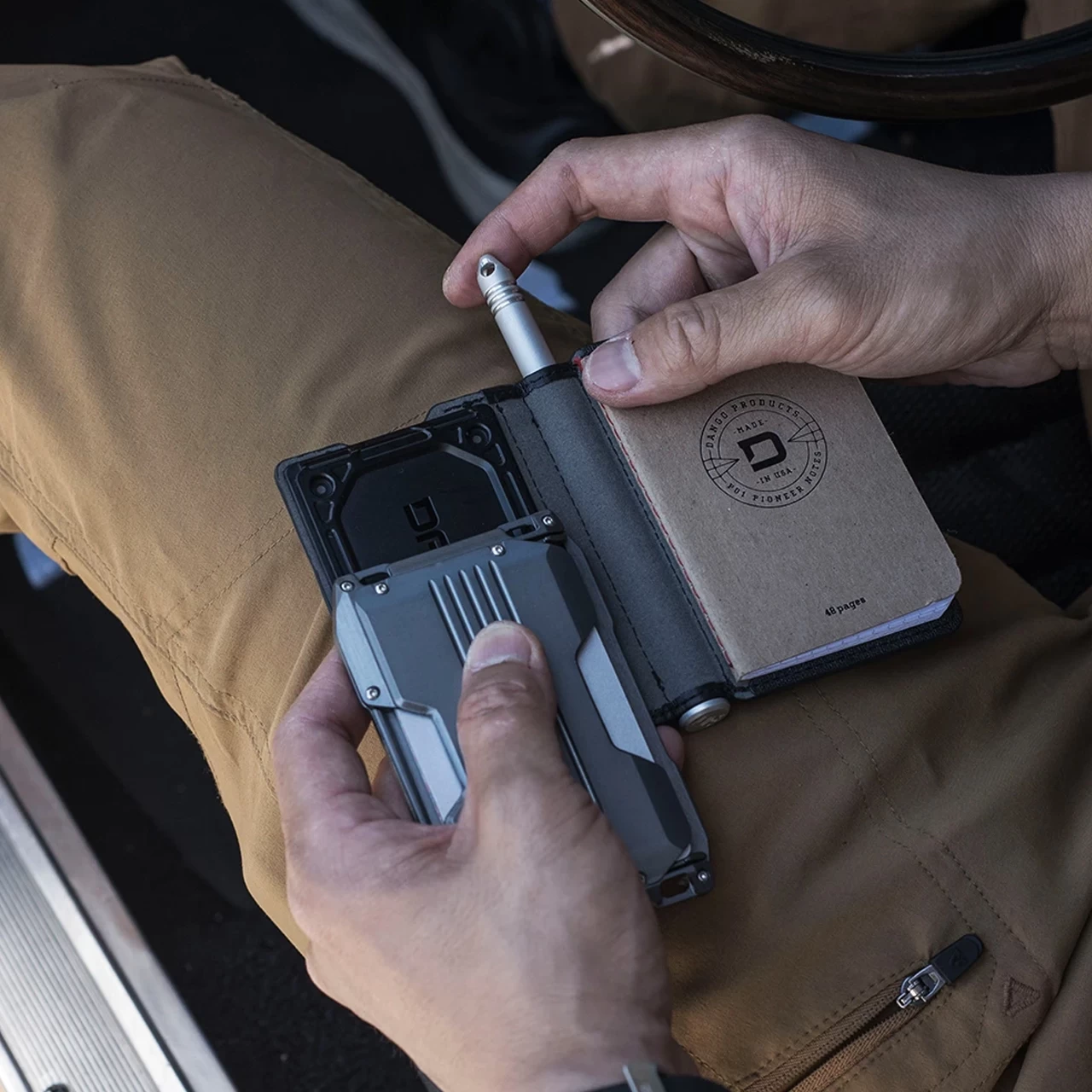 The Dango A-Series Adapt Wallets combine specific characteristics & functions from its iconic predecessors. It is truly a unique wallet that encompasses all the attributes of a modular Dango wallet. Exclusively, the A10 Wallet requires no tools to quickly adapt from one wallet to another. The Dango A10 Adapt Bifold Wallet can also be used by itself as a great slim all aluminium RFID blocking wallet or transform into a high capacity bifold wallet with its full range of pocket adapters. The adapters all share an innovative quick release sliding back-plate that swiftly glides along the A10’s rail system. The rail system not only holds pocket adapters, but it double functions as an open ID window for one card making it a sole player in the wallet world.