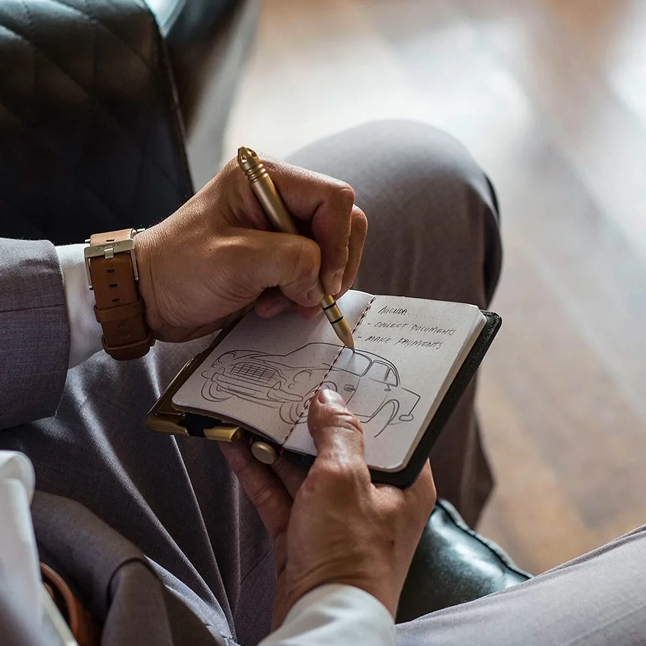 A Hero has his/her agenda dialled at all times. There is no better way to do that with a Dango D007 Pen Wallet. Inspired by James Bond, Dango products has released yet another “D007” edition wallet – this time with polished gold aluminum, a plush jet black leather bifold pen pocket and an exclusive polished gold pen along with Dango’s classic P01 Notes. Introducing the D007 Pen Wallet.