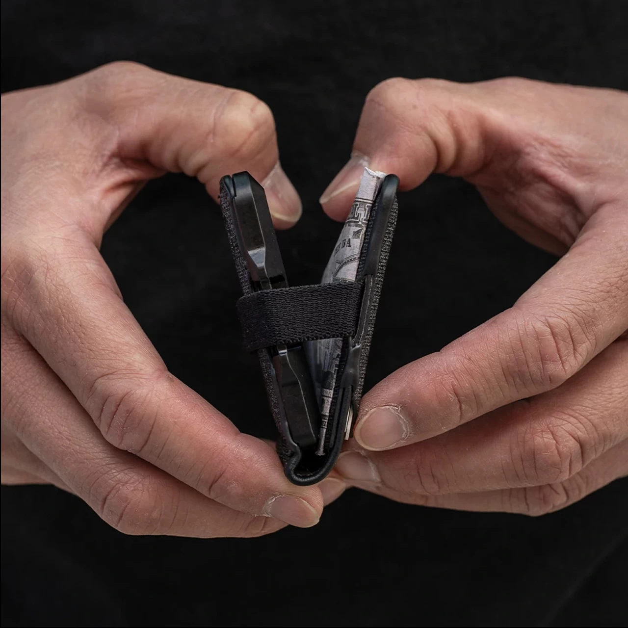 - Rail system with bifold 3-pocket design to hold up to 14 cards. Integrated elastic band to hold additional cash and cards or to enclose the wallet.