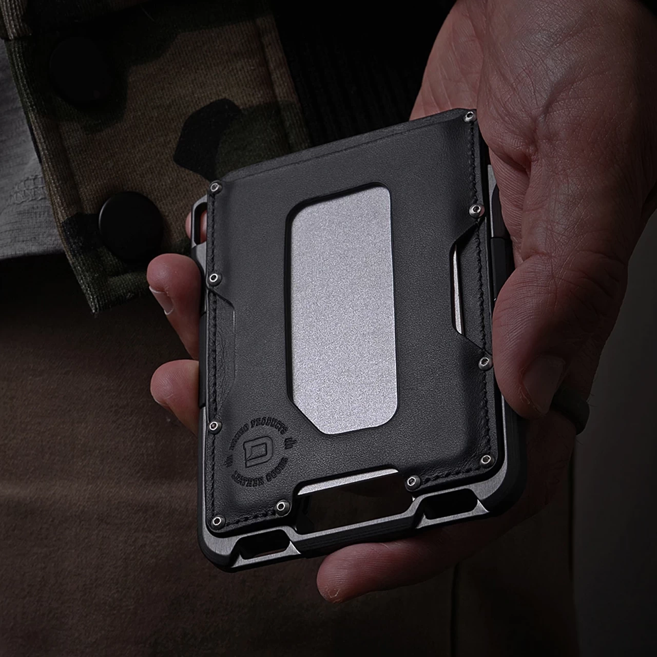 Genuine leather – Silicone wallet band – Anodized aluminium wallet frame – Stainless steel screws