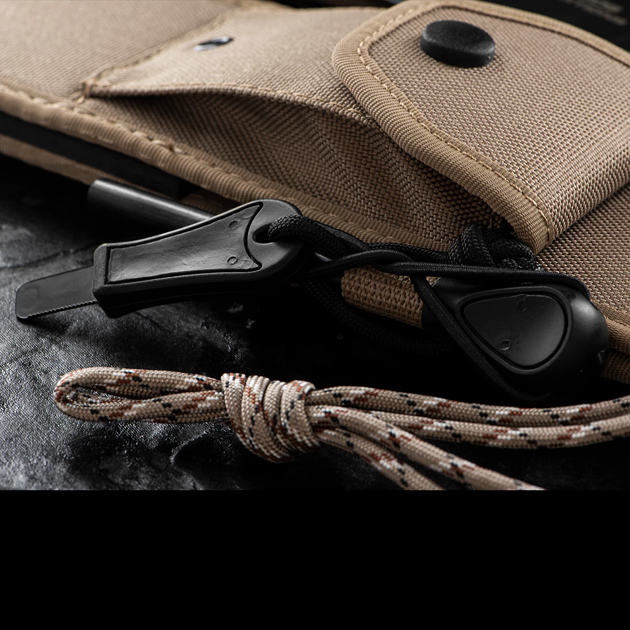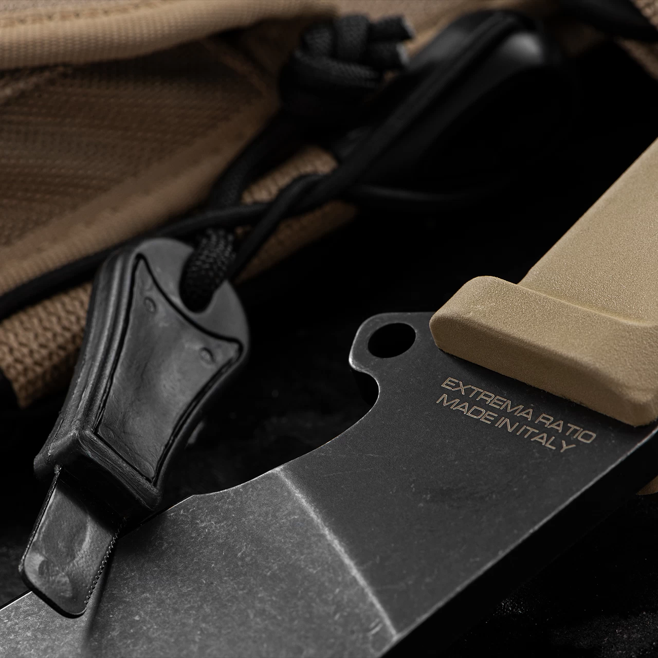 It comes with a desert cordura sheath with MOLLE system, a safety carry shoulder belt, a mini puch containing a paracord with flammable filament, which can be used in case of emergency and/or difficult climatic conditions, and a Firesteel for lighting fires.