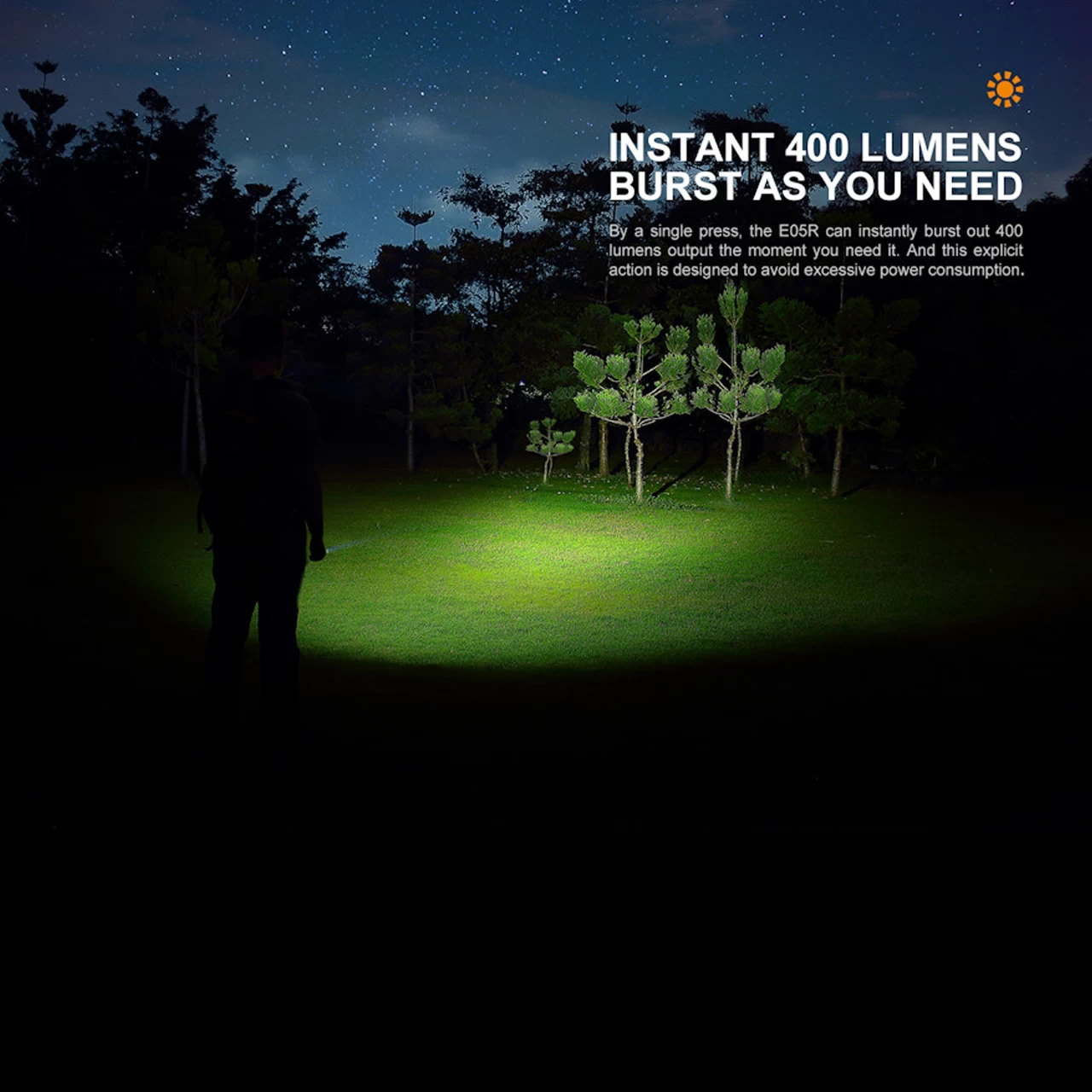 E05R EDC torch features 3 brightness levels plus a powerful 400 lumen burst mode: