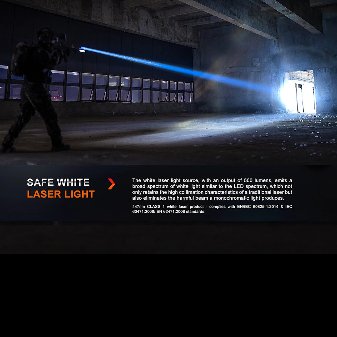 High: 500 lumens (2 hrs 20 min total inc step downs), 1500m beam.