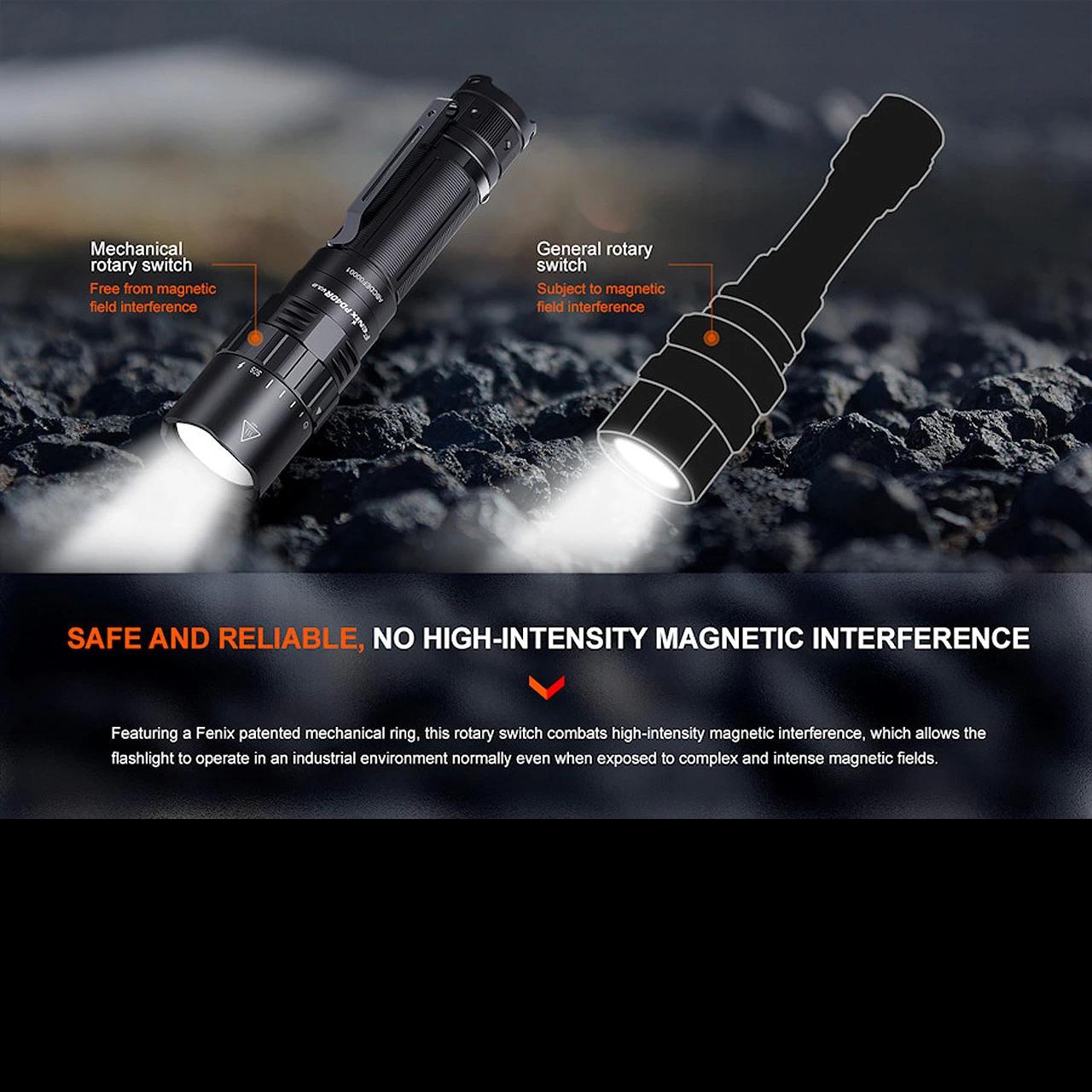 The Fenix flashlight offers four brightness levels, ranging from 30 to 3000 lumens, plus a 2500 lumen strobe mode.