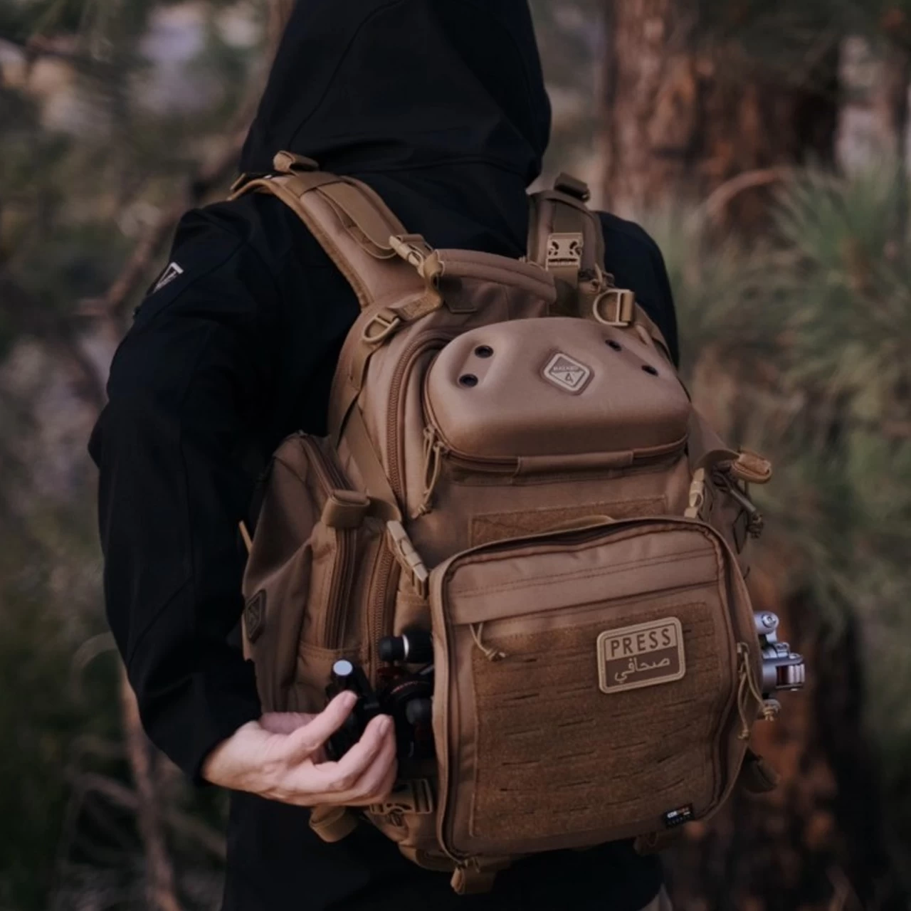 The back panel adds structure, back safety & air circulation, and also has a removable luggage trolly-handle strap. When this luggage strap is off, loops are left for carabiners, etc. Drawbridge comes with a removable, minimal waist belt with patented roto-lock buckle, and fuzzy liner on inner walls for optional dividers/photo bin inserts. Side compression straps can hold objects to pack’s sides, and there’s a large flat pocket under carrier & on pack-back. Other features include: supersized laser-cut MOLLE & velcro i.d. patch panel, MOLLE loops on 3 sides & harness for pouches, etc., and sternum strap with elastic auto-adjust, 2-position belt height.