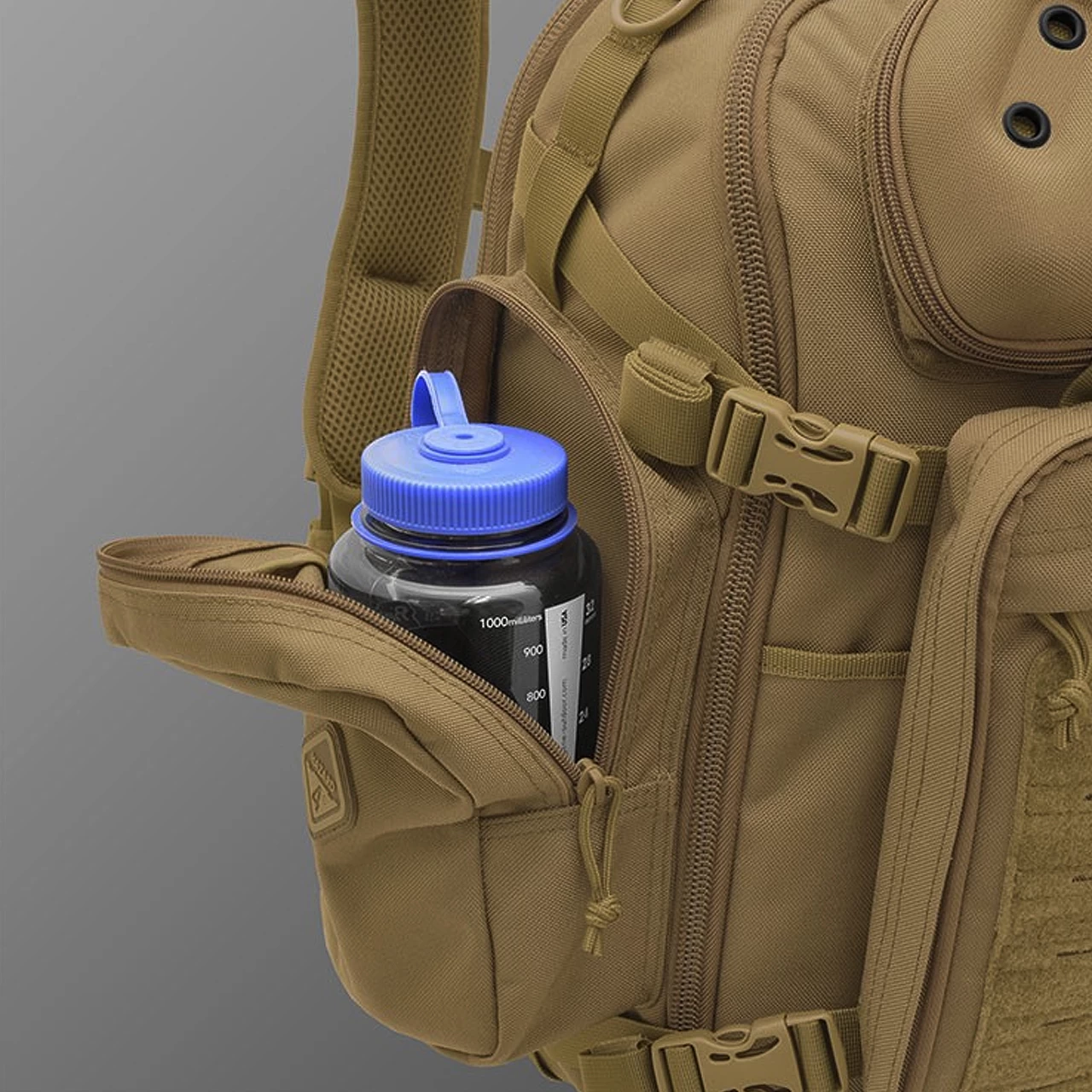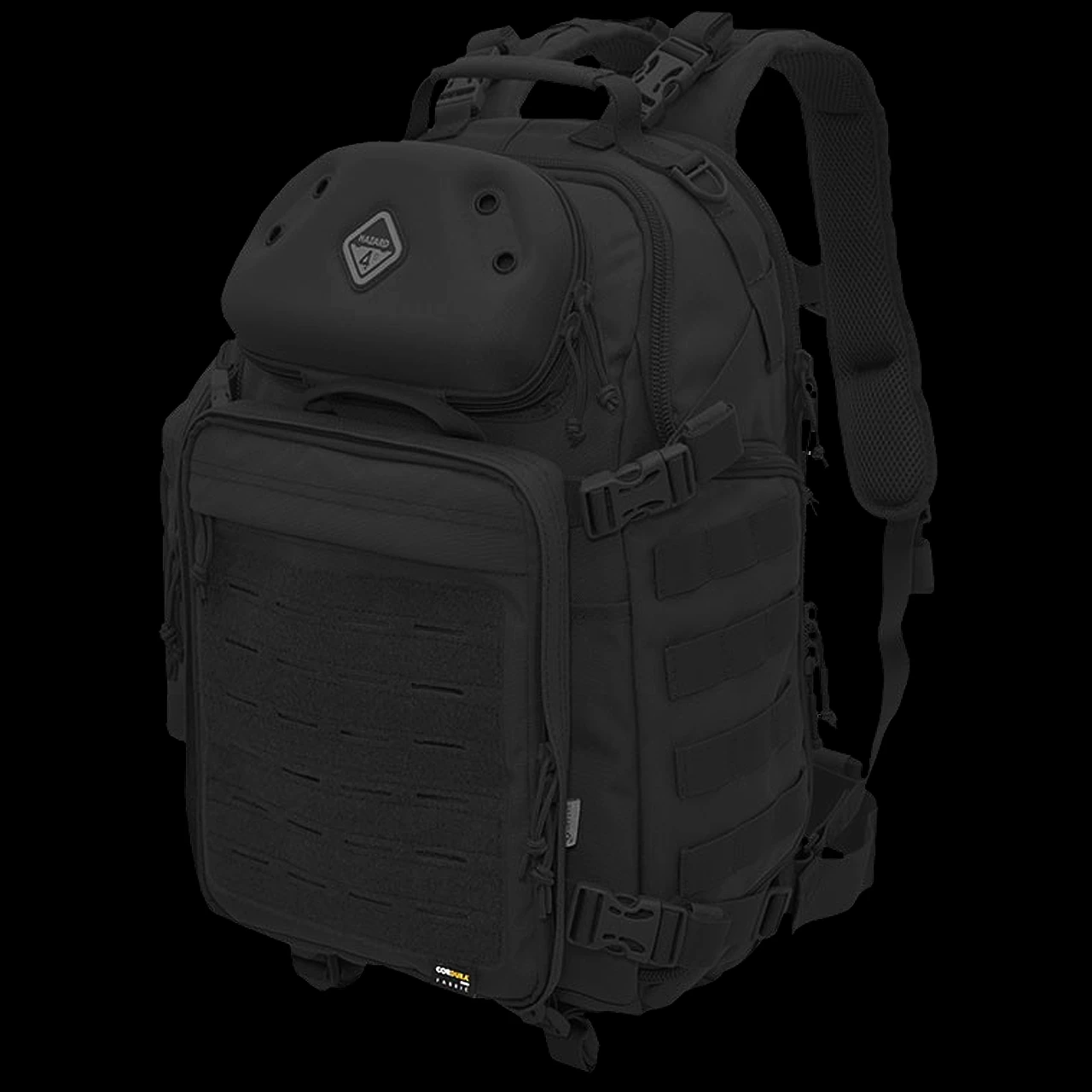 The Hazard4 Drawbridge is Hazard4’s first daypack with an external load-carrier ‘beavertail’ for helmets, jackets, etc. The carrier can flip 180° down to manage long loads, and the bottom hinges allow detaching & expanding. Drawbridge has a unique top, perimeter, or side sling-style zipper access choice, and the load carrier has an admin area. There’s a molded top-shell to protect optics, and other breakables. A large zip pocket on the side fits Nalgene bottles, radios, etc., and a padded laptop/hydration area in soft molded back panel can fit laptops up to 17″.
