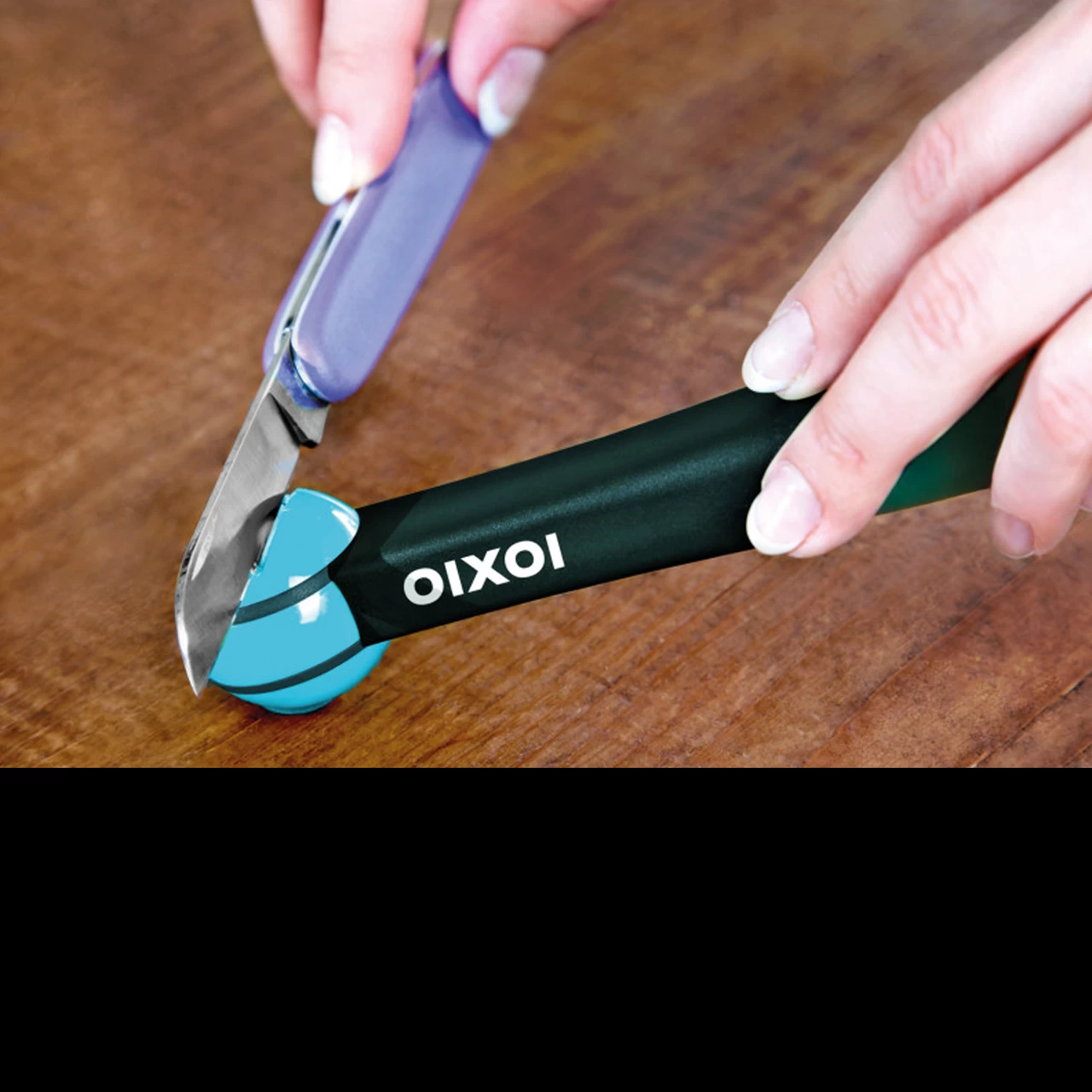 All IOXIO knife shears are made of aluminum oxide ceramic. They combine the hardness of the whetstone with the shape of the traditional sharpening steel. The ceramic grinding surface achieves a material abrasion on the blade, sharpening it and reshaping it on the cutting edge. IOXIO knife sharpeners are not coated. They are made of an all-ceramic sharpening rod and do not wear out during sharpening.