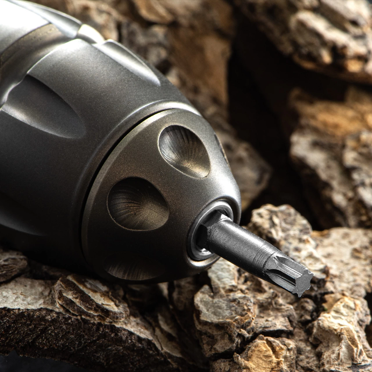 The, frankly beautiful, design features six tools all stored within the capsule and accessed via the screw top. There’s a blade, four torx bits, a flat head screwdriver and a tungsten carbide glass breaking tip. A colour coordinated Titanium carabiner is attached which will really turn heads in the office, the building site or on the commute.