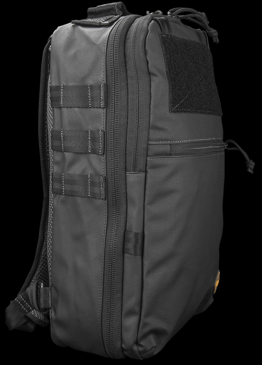 The 500 Denier material is waterproof and extremely tough. The slimline but roomy interior is perfectly suited to books, folders and a laptop/iPad (the rear section is padded to protect fragile items). The main compartment features a zippered web pocket, a section to add pouches and pockets and a large sleeve for you iPad. The front section has one large surface for added modular pockets and loops and opens flat to access your EDC items. There is also a front zippered pocket for keys, wallet and vital documents.