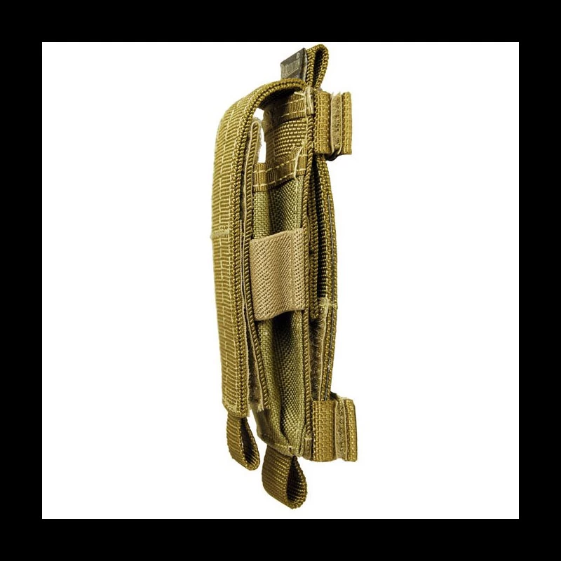 Maxpedition’s durable single sheath can hold an extra flashlight, small cellular phone, multitool or folding knife. It can also be attached to your backpack as an accessory or be carried on the belt upright or sideways. The length of sheath lids (both Single Sheath and Double Sheath) are adjustable with internal Velcro attachments for longer items or are completely removable for those who want the quickest access.