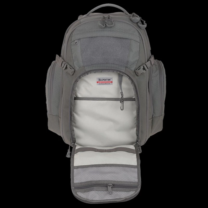 The Maxpedition Tiburon Backpack is an ergonomic pack with quick release yoke-style straps. There is a top zippered slip pocket with a loop field for patch adhesion, a front admin pocket for added organization, two zippered side pockets, a middle tech compartment, and a fully opening & lockable middle compartment. The middle tech compartment has a padded pocket sized to fit a 13″ laptop and most tablets. The main compartment has a hydration reservoir, and there are dual hydration tube ports.
