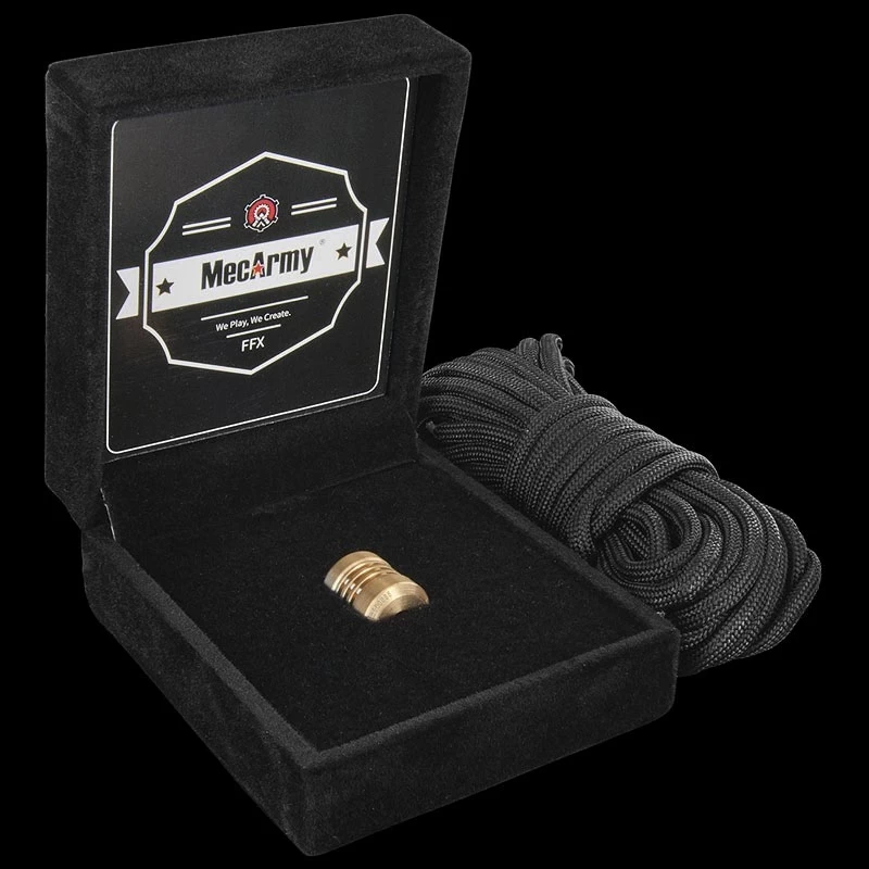 The MecArmy FFX Bead is a beautifully crafted brass bead in a “Chinese lantern” design. Also supplied is a 5 metre length of black paracord to make your own lanyards for your knife, flashlight or rucksack. It is supplied in a velvet gift box.