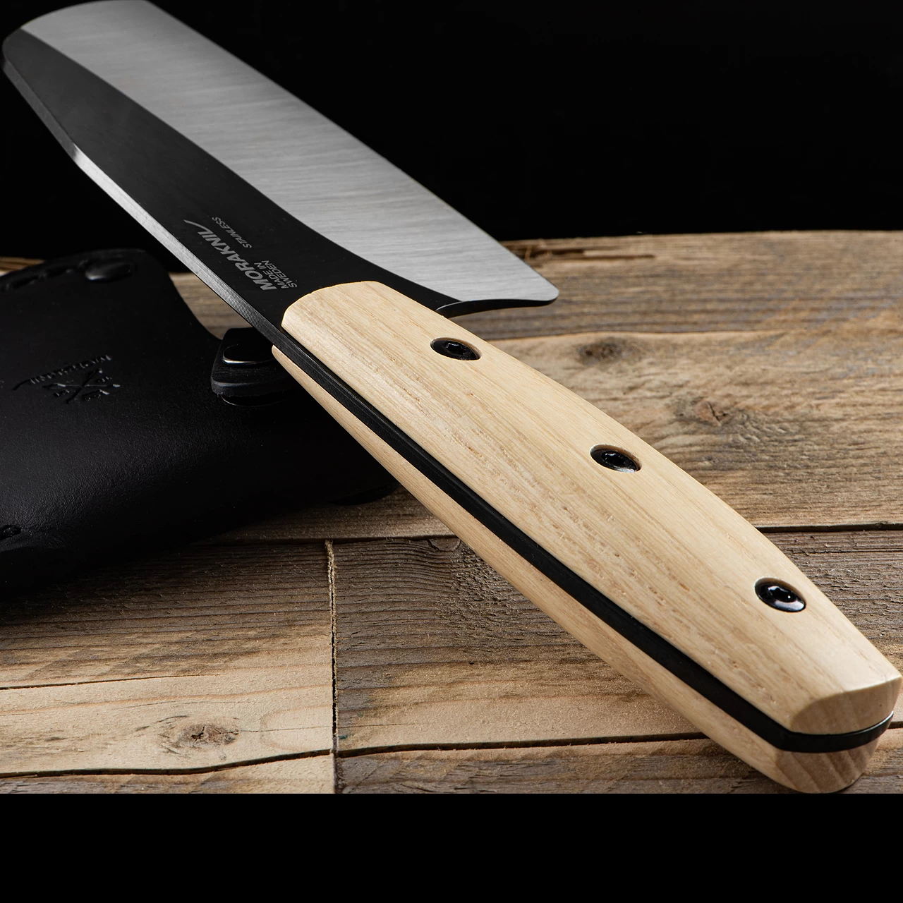 The Mora Rombo is a handmade full tang knife optimised for outdoor cooking. The ergonomic handle of carefully selected bright ash wood from European FSC certified forests, and the large black knife blade made of recycled Swedish stainless steel, with its distinctive food grind, allow you to improve your cooking skills in the great outdoors. Season your next meal with the forest pantry and prepping your food will forever be a culinary experience.