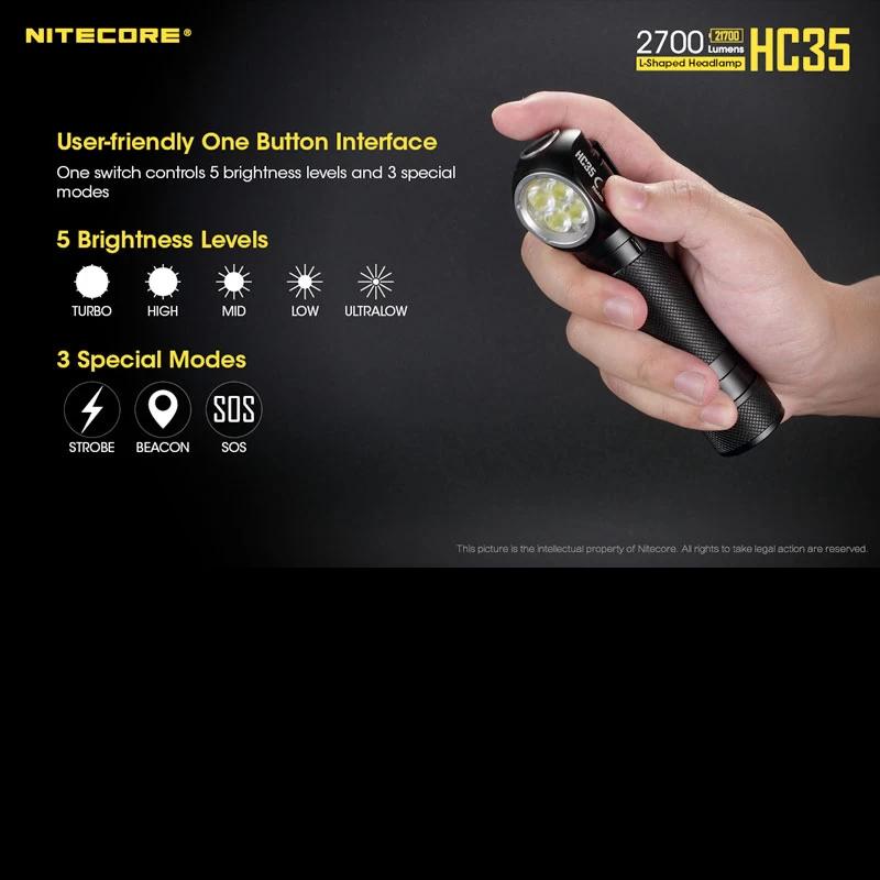 The Nitecore HC35 has a simple user-friendly interface made up of one button on the head of the light which controls all five brightness levels and three special modes.