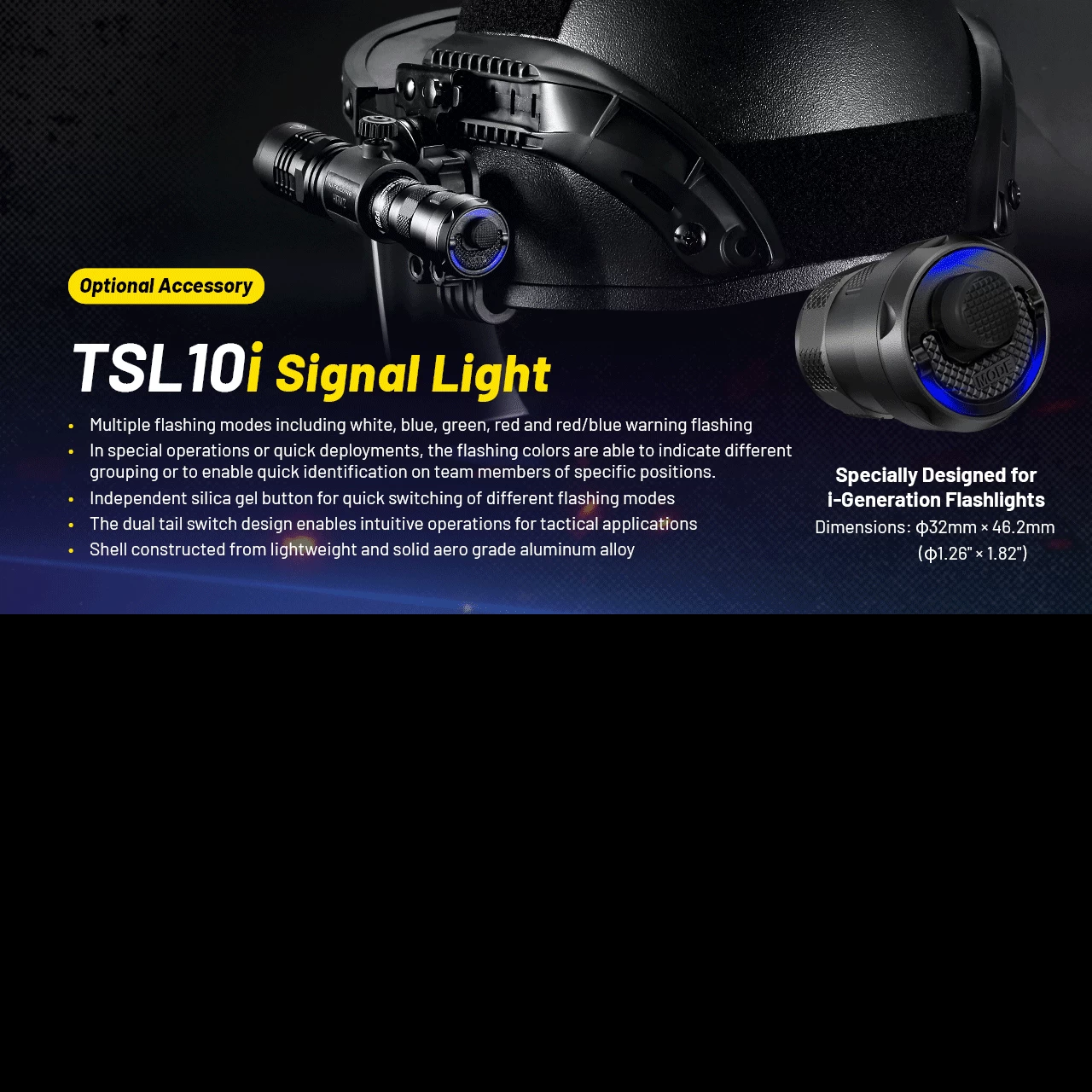 The P23i has a range of tactical features including a bezel for emergency use, impact resistance up to 2 meters, a dedicated tactical mode and one-hand operation. The flashlight is compatible with a variety of accessories including the Nitecore RSW2i remote switch, TSL10i signal light, gun mounts and 32mm filters, diffusers and traffic wands (all sold separately).