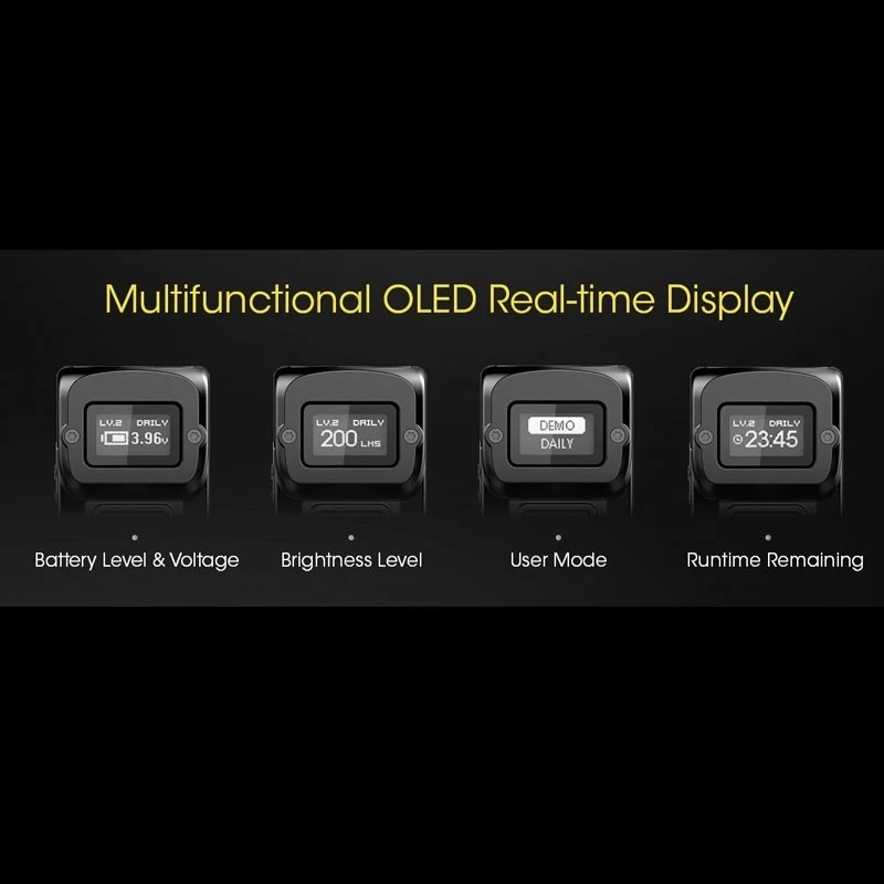 The keyring light offers five brightness levels, ranging from 1 to 1000 lumens, all of which are operated by a dual side switch interface. The TUP features a multi-functional OLED display which provides real-time information on the battery level and voltage, brightness level, user mode and remaining runtime.
