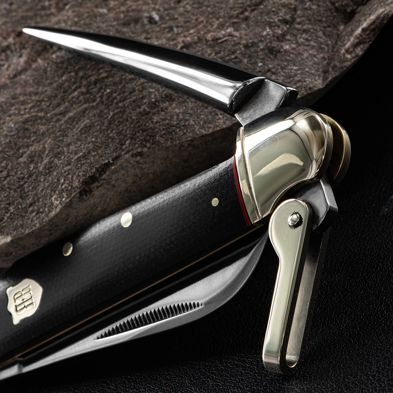 The Rough Rider Highland Marlin Spike is a powerfully built folding knife that you can depend on out the toughest environments. It features a 440 stainless steel Sheepsfoot blade and a 7.0cm marlin spike designed to get those troublesome knots open but has many other uses too. There is also a locking bail to attach to pockets and packs. The attractive handle is a combination of black Micarta with red spacers, ringed and embossed nickel silver bolsters, and a nickel silver Rough Ryder shield.
