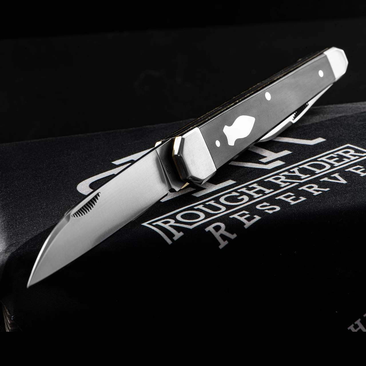 The Rough Ryder Reserve Black Micarta Dude Whittler features D2 tool steel Wharncliffe and Sheepsfoot blades with match strike pulls and a satin finish.