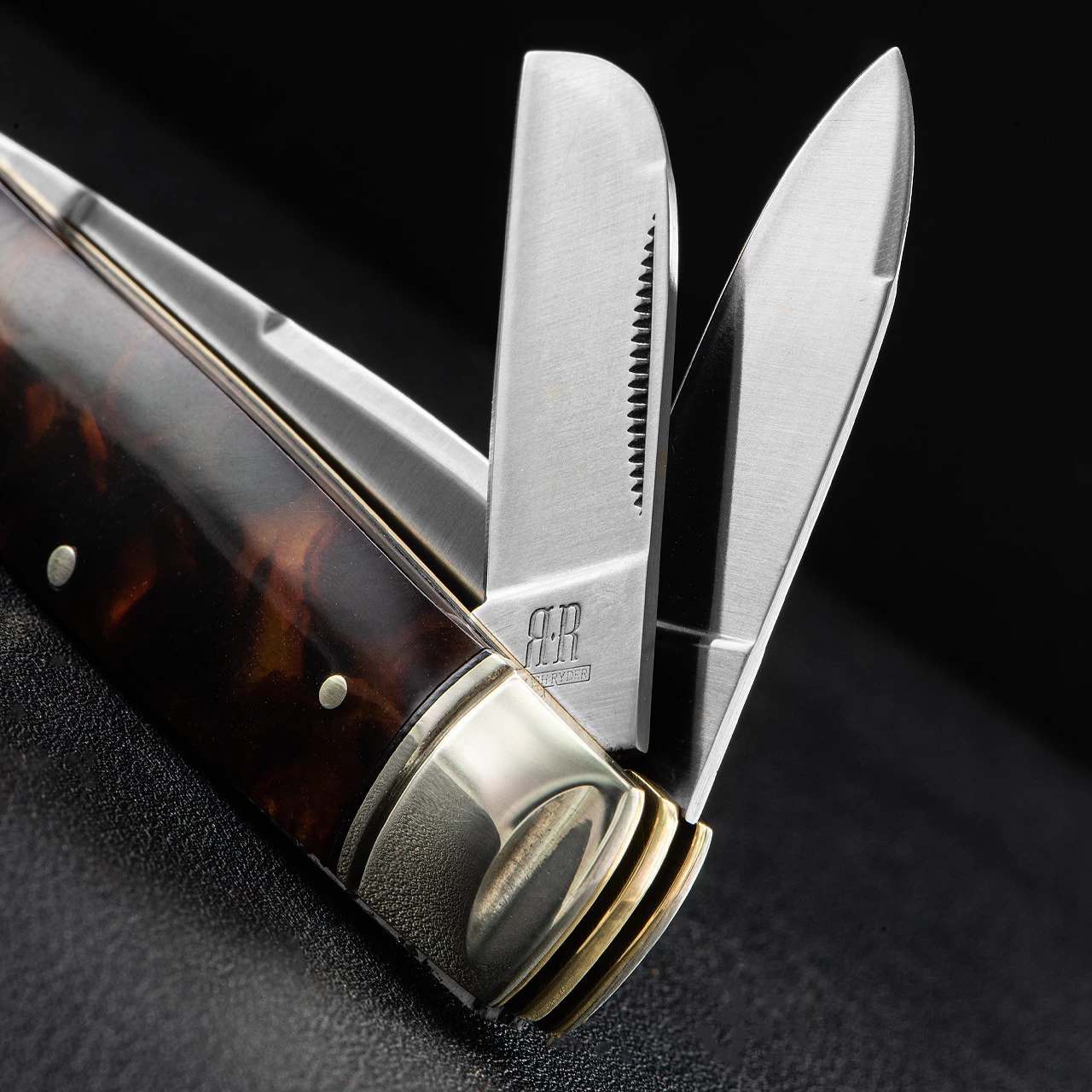 All the knives in the Rough Rider Tortoise Shell Series feature 440B stainless steel blades with match strike pulls and a satin finish. The handles are beautifully crafted synthetic tortoise shell with brass liners, nickel silver pins and bolsters, plus a special tortoise shell shield.