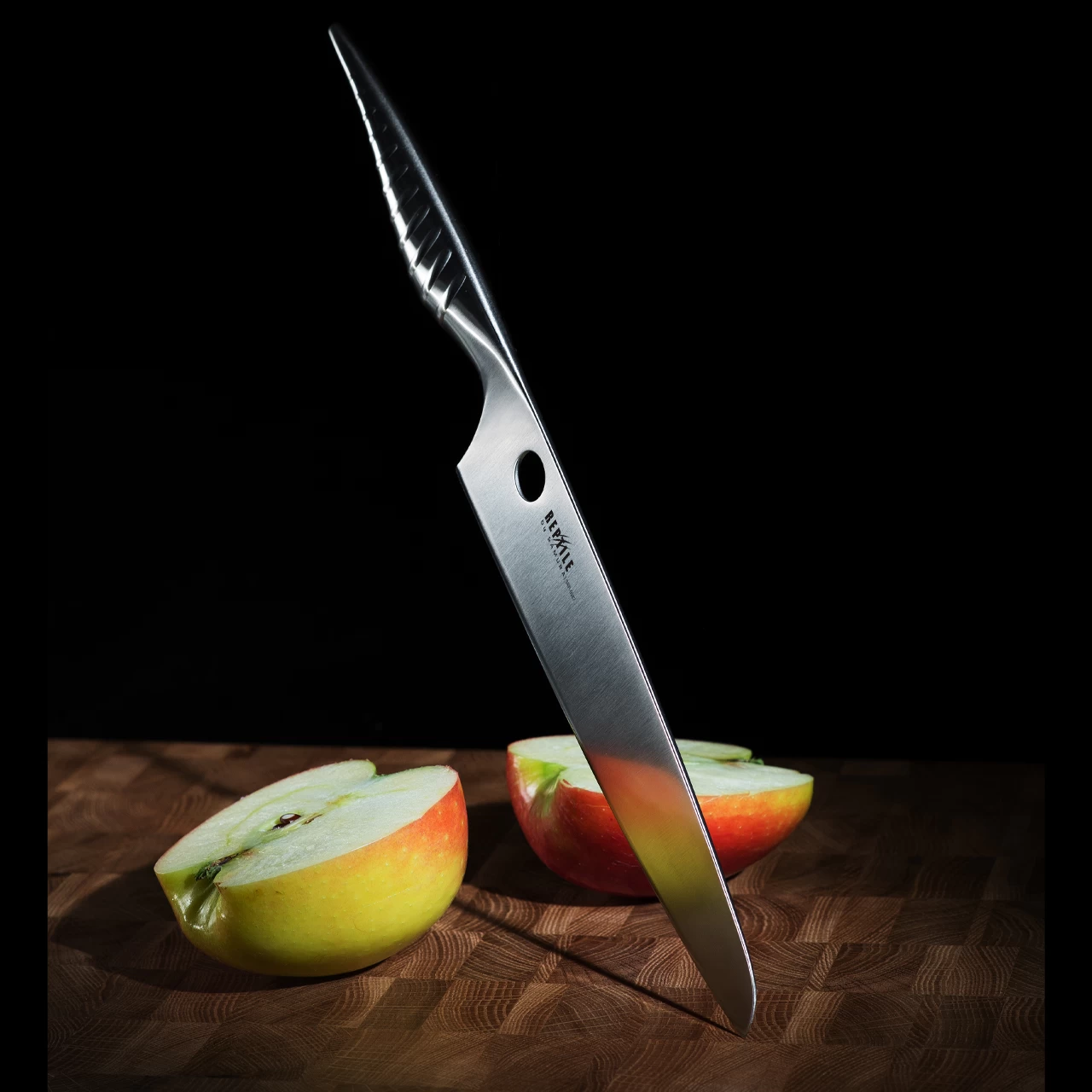 The Samura Modern Chef’s Knife Reptile 20cm has a stainless “reptilian” decorated handle which will grace any kitchen both professional or domestic. Among the most versatile of knives, this is the one you’ll use every day for a wide range of operations, such as chopping, slicing, shredding, dicing and mincing. The steel hardness of 61 HRC makes it possible to deal with even the tenderest material easily.