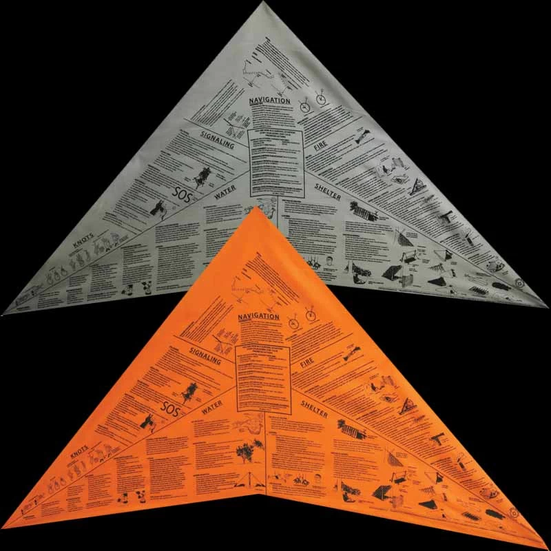 The Head for Survival Triangular Bandana / Cravat is a multi-function tool that provides a wide variety of uses in one piece of gear. This critical piece of equipment contains vital survival information organized by topics: Navigation, Fire Starting, Shelter, Water Collection & Purification, Signalling, a useful Knots section, and a section for Priorities considerations. Printed in non-running ink and constructed from soft-brush polyester that provides a comfortable feel and durability. The edging seams are lock stitched for increased strength. Survival experts across the world agree that a bandana is a very useful piece of gear in a survival situation. From covering the head to prevent sunburn, to water collection from dew, to tying slings and splints for first aid uses; bandanas can perform many vital tasks for the survivor. The Head for Survival bandana performs these functions very well, and much more.
