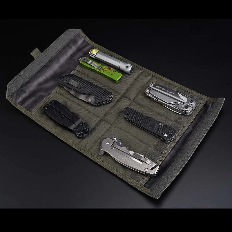 It offers 6 micro-fiber padded pockets with strong velcro closures. You can store anything you want to keep safe from knives, pocket tools, flashlights, tac pens, and more. Each pocket measures approximately 15.2 x 7.6cm, which will hold most average size folding knives. A tough nylon carry strap and an outer velcro loop field finish off the outstanding design.
