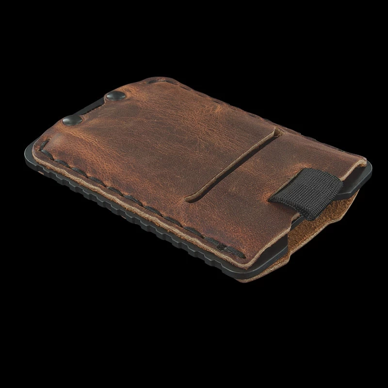 This wallet is minimalist by design. In your EDC, you probably only need a couple of cards and a few notes. This wallet has space for four bank cards, two on each side. One side is accessed through a finger-push window, the other by a nifty release strap – pull on this and your cards rise out to meet you. There’s a slot in the side into which you can poke your bank notes.