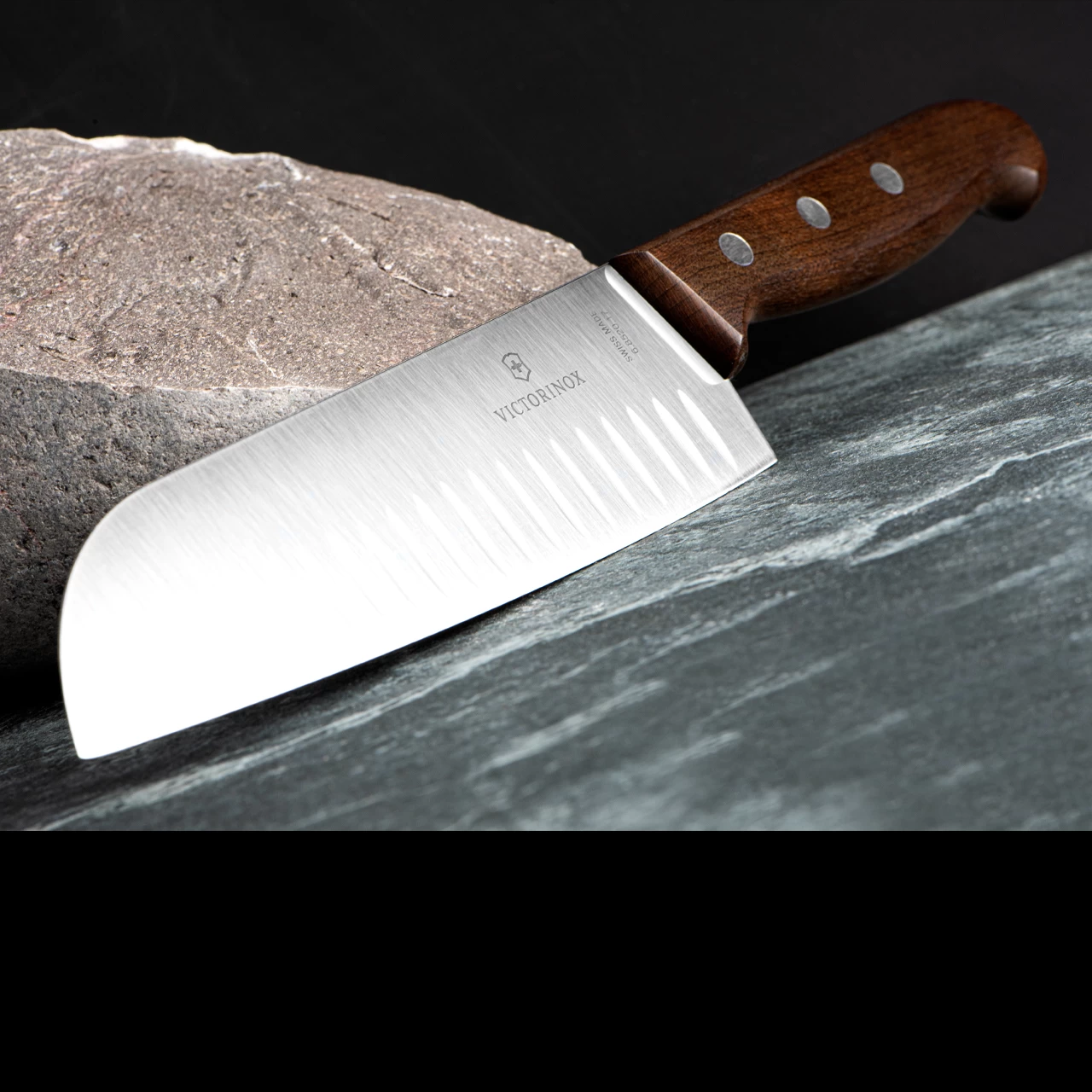 Where perfect form and function fuse: the Victorinox 17cm Wood Santoku Knife with fluted edge is inspired by Japanese kitchen knives, world renowned for their exacting precision and robust culinary blueprint.