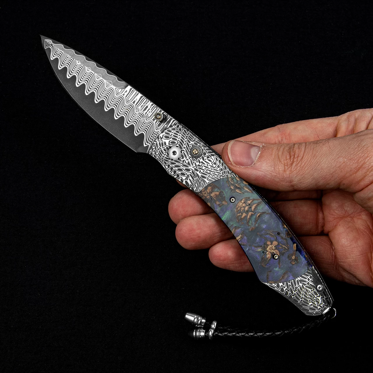 The William Henry Spearpoint ‘Big Easy’ features a beautiful frame in ‘River Rock’ Damascus by Chad Nichols, inlaid with mini pine cones in resin. The blade is ‘Wave’ pattern damascus steel with an extra-strong core of ZDP-189. William Henry’s patent-pending Wave Damascus features a core in ZDP-189 (HRC 67) or VG-10 (cryo-tempered to a hardness of HRC 61) for superior sharpness and edge retention over time. The core of the blade is clad with alternating layers of stainless steel and nickel silver. The billet, 45 layers in all, is patterned with a custom die to create the undulating waves that emerge across the bevels of the blade. This material can be dark-etched for contrast, or etched and re-polished for a more subtle pattern.